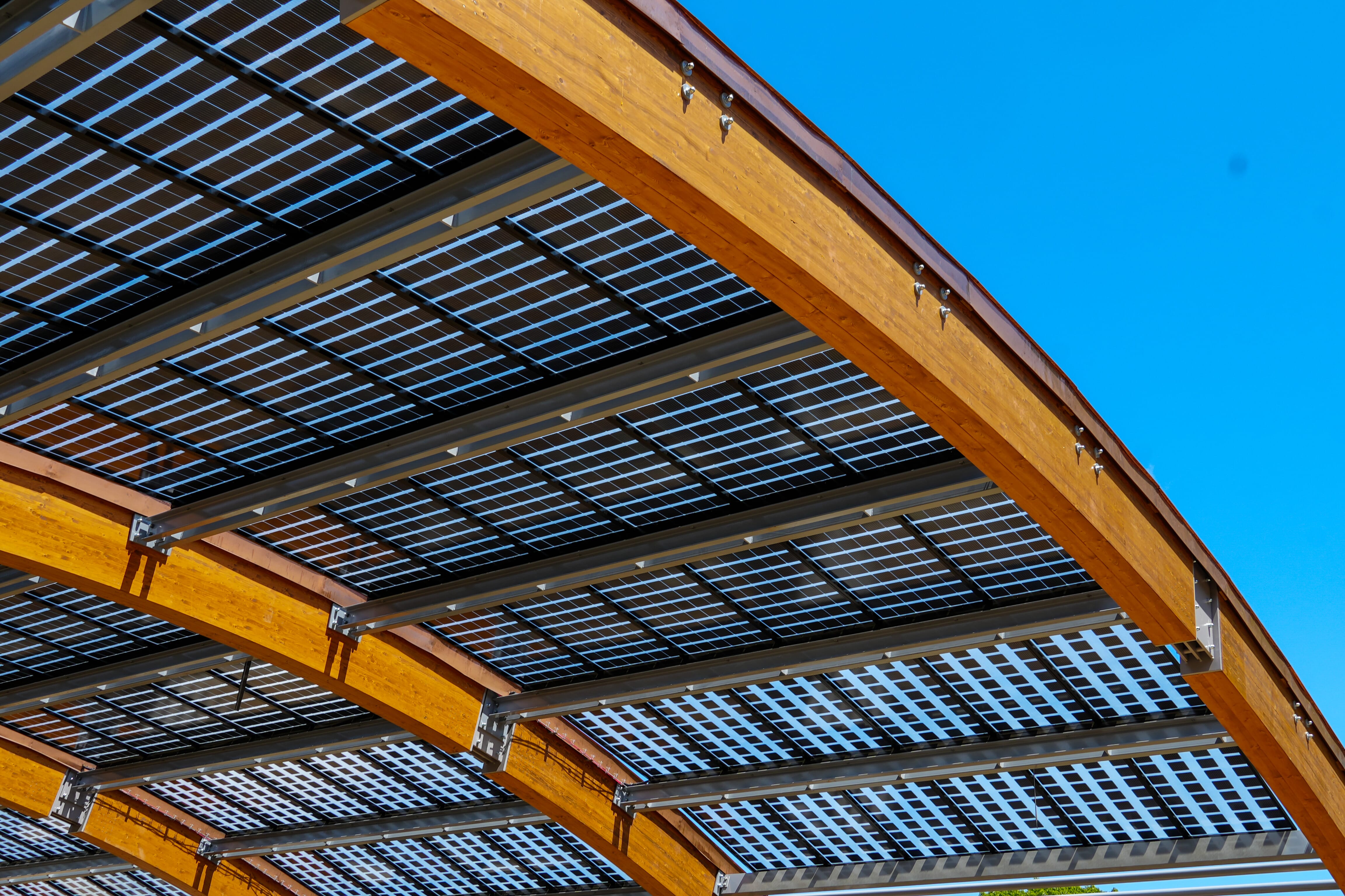 To achieve this, Lumos architectural solar solutions use frameless photovoltaic (PV) modules that are built directly into buildings, structures, and architectural plans. This approach delivers top-tier energy performance with a clean, modern look. Some of our most innovative and effective solutions include our solar carports, canopies, awnings, walkways, pergolas, and building-integrated photovoltaics (BIPV)—even on curved and vertical facades.
